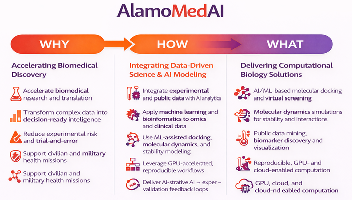 AlamoMedAI operates through a closed-loop experimental–computational workflow in which wet-lab experiments inform AI/ML modeling, and computational predictions directly guide experimental validation. Our multidisciplinary team integrates machine learning, deep learning, molecular simulations, and GPU-accelerated high-performance computing using validated, open-source, and reproducible workflows aligned with NIH, DoD, SBIR/STTR, and CDMRP standards.