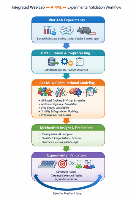 Integrated computational–experimental workflow employed by AlamoMedAI. Experimental data generated in wet-lab systems are curated and analyzed using AI/ML-enabled modeling, molecular dynamics, and free-energy calculations. Computational predictions inform mechanistic interpretation and guide iterative experimental validation, enabling data-driven decision-making and reduced technical risk.