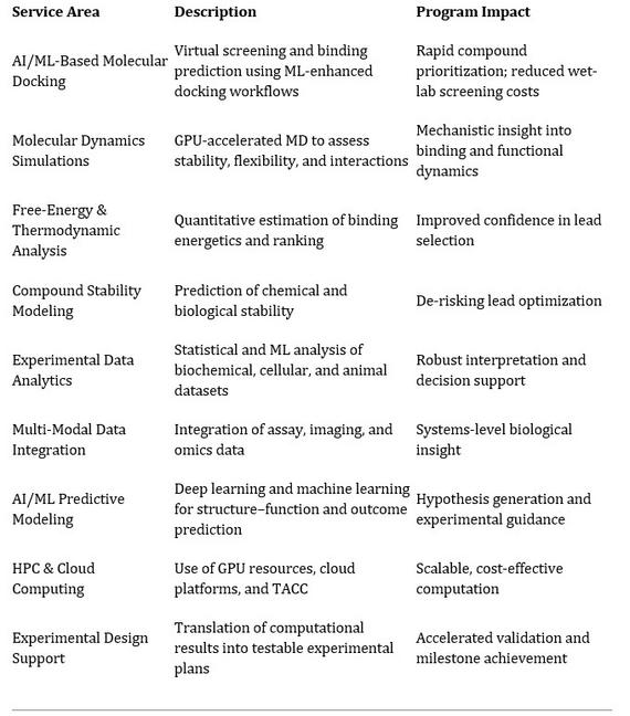 AlamoMedAI is explicitly structured to guide experimental design, not merely analyze results. AI-assisted modeling outputs are used to prioritize compounds, refine assay conditions, identify mechanistic drivers, and generate testable hypotheses, enabling a closed-loop workflow between computation and experimentation. This approach reduces trial-and-error, enhances rigor, and accelerates translation—key evaluation criteria for DoD and NIH reviewers.
