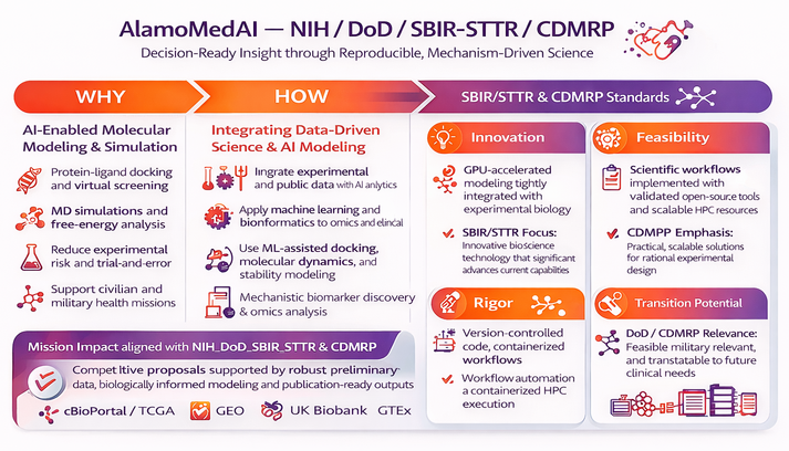 Aligned with SBIR/STTR and CDMRP expectations, AlamoMedAI emphasizes innovation, feasibility, scalability, and transition potential. Our multidisciplinary team integrates computational chemistry, molecular biology, biophysics, machine learning, and GPU-accelerated computing to analyze biomolecular data across discovery, optimization, and validation stages. The platform supports projects ranging from small-molecule discovery and biomolecular interaction studies to mechanism-driven interpretation of complex biological and animal datasets relevant to military and civilian health.